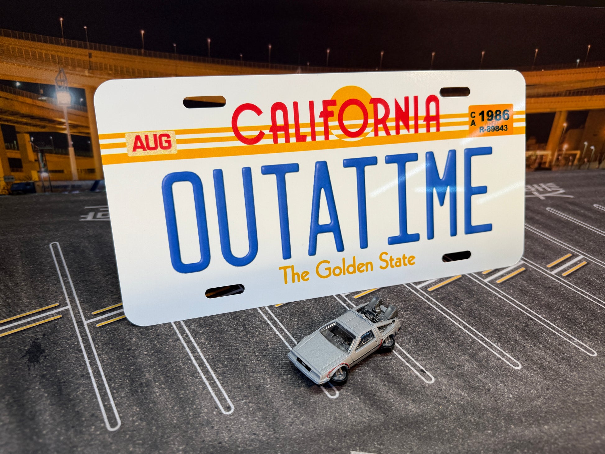 Recreate a piece of film history with the iconic OUTATIME license plate , the same one worn by the DeLorean in the Back to the Future saga .